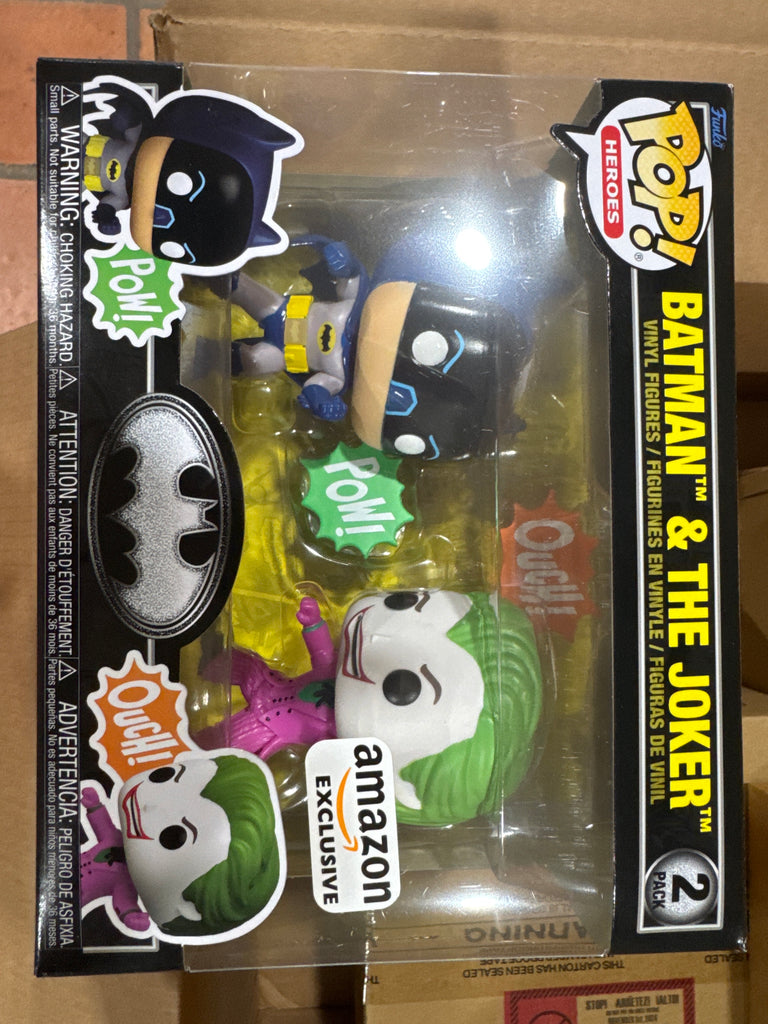 This Batman 85th Anniversary Batman & The Joker Funko Pop! Vinyl Figure 2-Pack - Exclusive comes packaged in a window display box. Each Pop! figure measures approximately 3 3/4-inches tall. Please note item will include sticker as pictured.