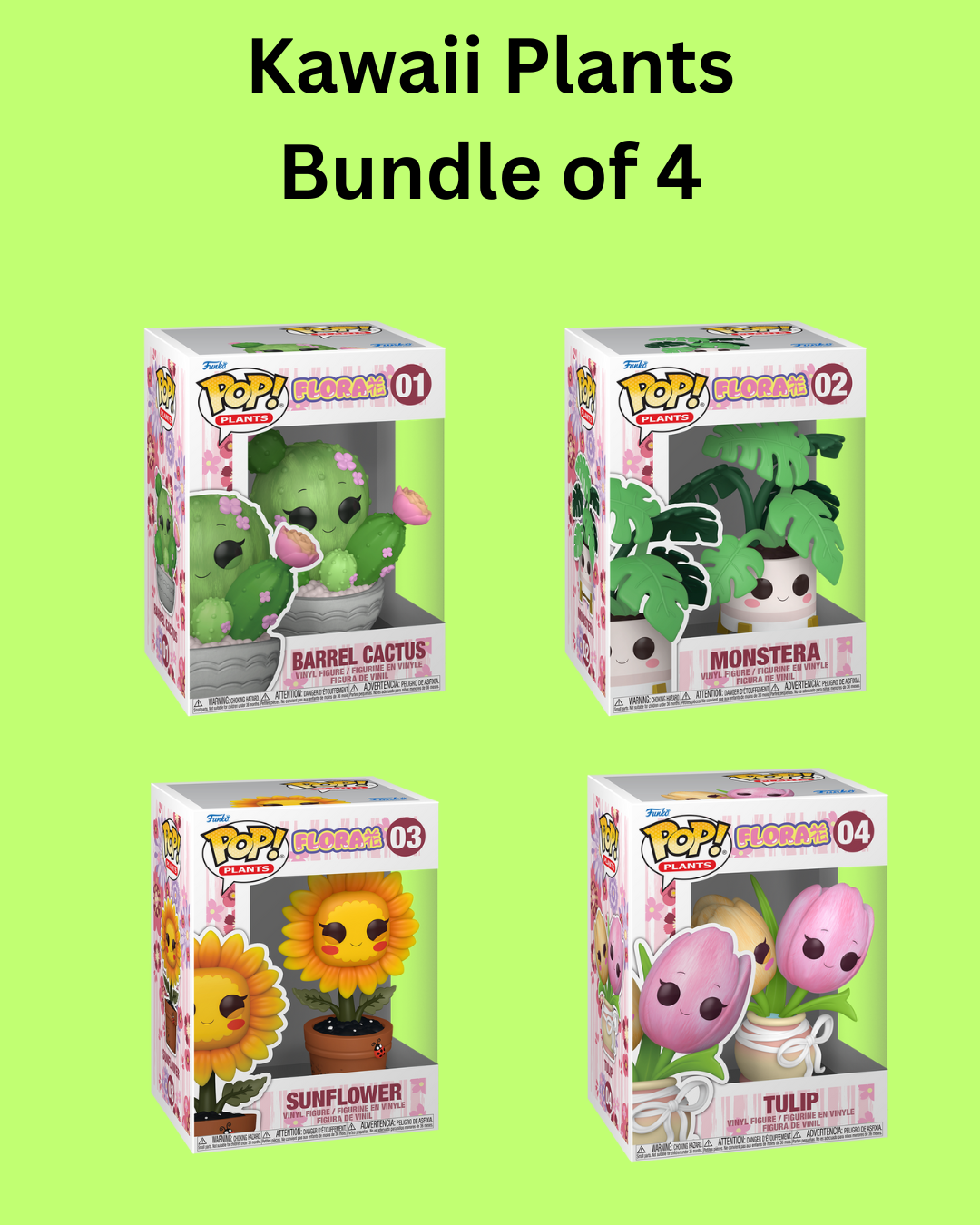 This Kawaii Plants Funko Pop! Vinyl Figure Bundle of 4 includes 4 individually packaged Pop! Vinyl Figures. Each figure measures approximately 3 3/4-inches tall and comes in a window display box. For ages 3 years and up.
